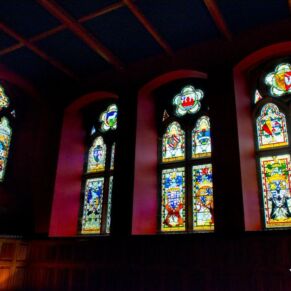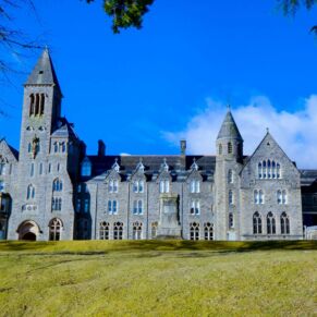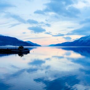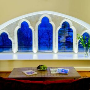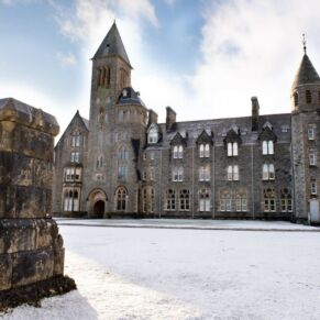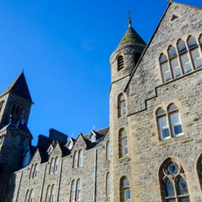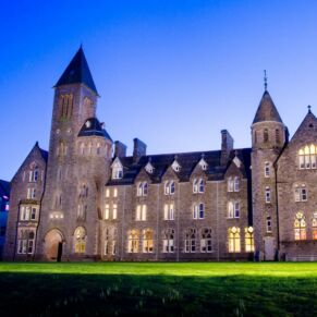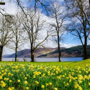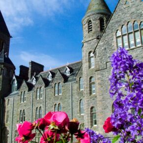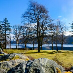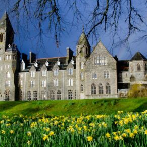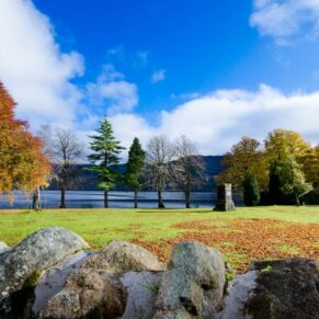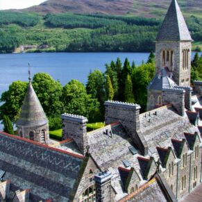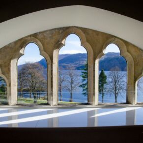 The abbey is set in 20 acres of secluded grounds with its mature trees and rhododendrons at the south end of Loch Ness, surrounded by the majestic mountains of the Scottish Highlands and with spectacular views up the entire length of the loch. The formal tree-lined avenue curves past the old schools’ original cricket green.