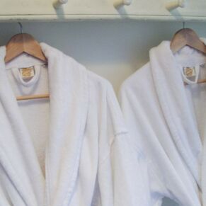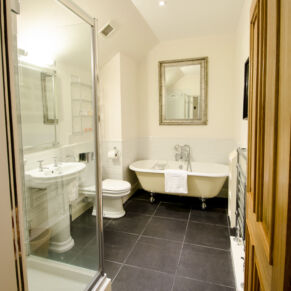 Bathroom: Full-size bath • separate power shower • white towels & dressing gowns • Arran Aromatics and Highland Soap Company toiletries