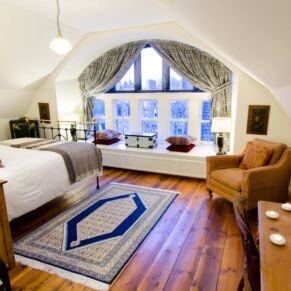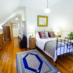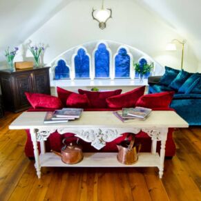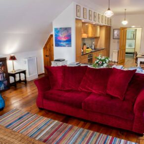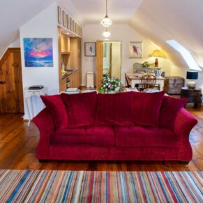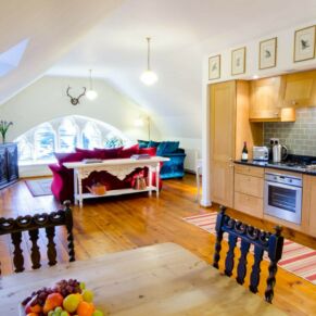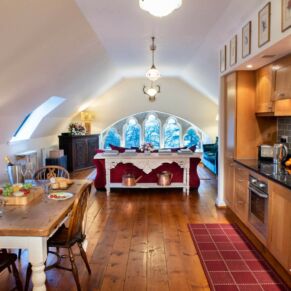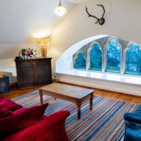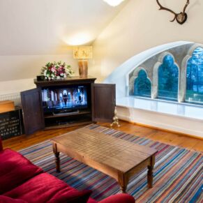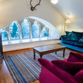 The apartment is located on the top floor, with a stunning view straight up Loch Ness from the stone mullioned window.
